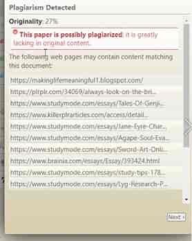 - At the top right hand side, you will see plagiarism detection, click on it and you will see the originality level of your content and URL that might contain the content in question as shown below